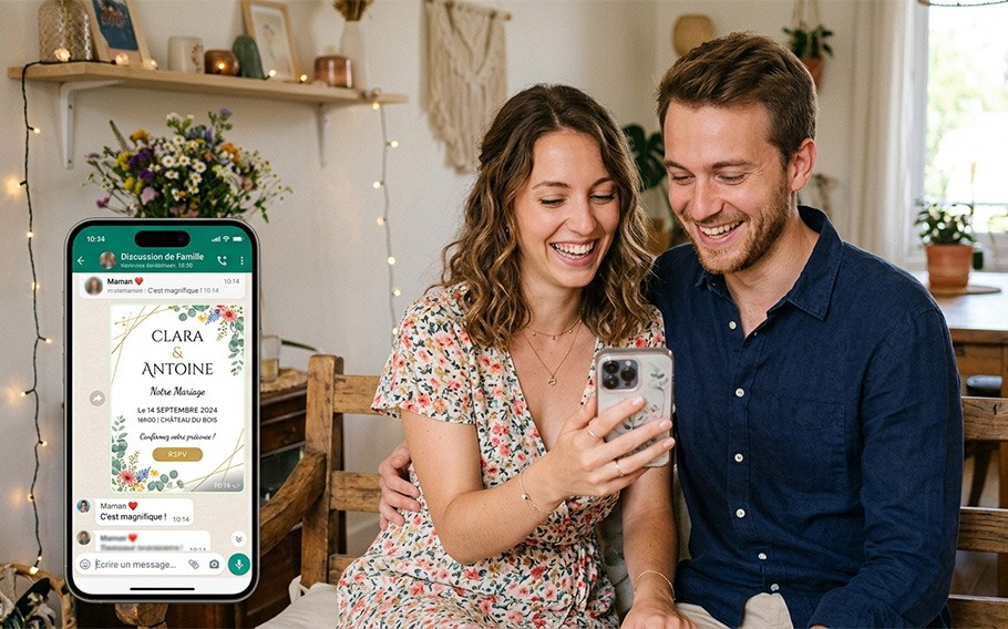 Ce mode d’envoi est particulièrement apprécié pour les couples qui souhaitent une solution simple, rapide et moderne, sans renoncer à l’élégance d’un véritable faire-part de mariage.
