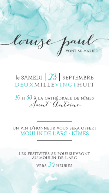 Le faire-part de mariage numérique tout en Aquarelle enveloppe vos invités d’un nuage de douceur grâce à son design moderne et élégant. Personnalisez-le en choisissant la couleur dominante de votre mariage avec ce modèle monochrome. : du romantisme en rose, voyager en turquoise, du gourmand en mocha et précieux en violet.